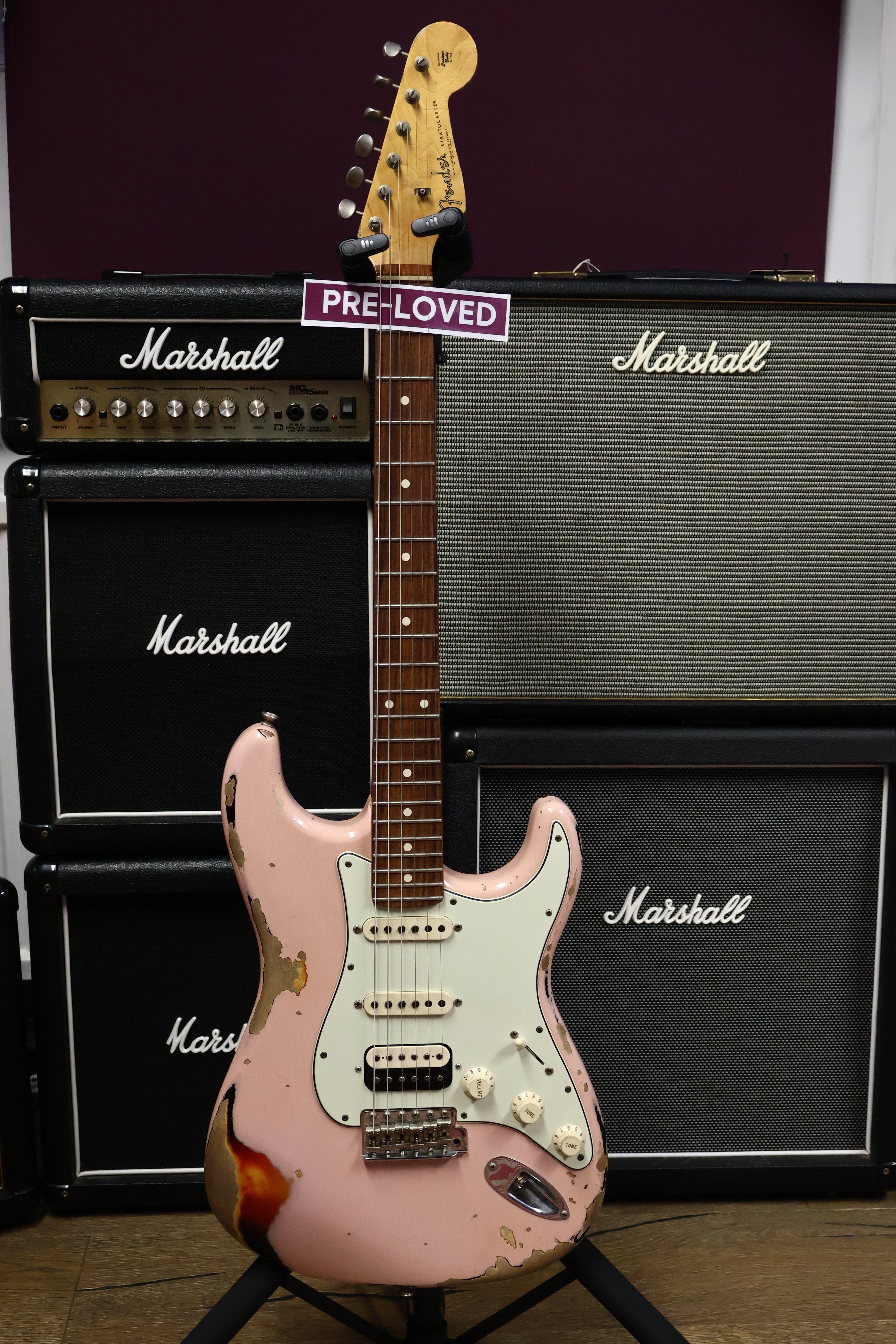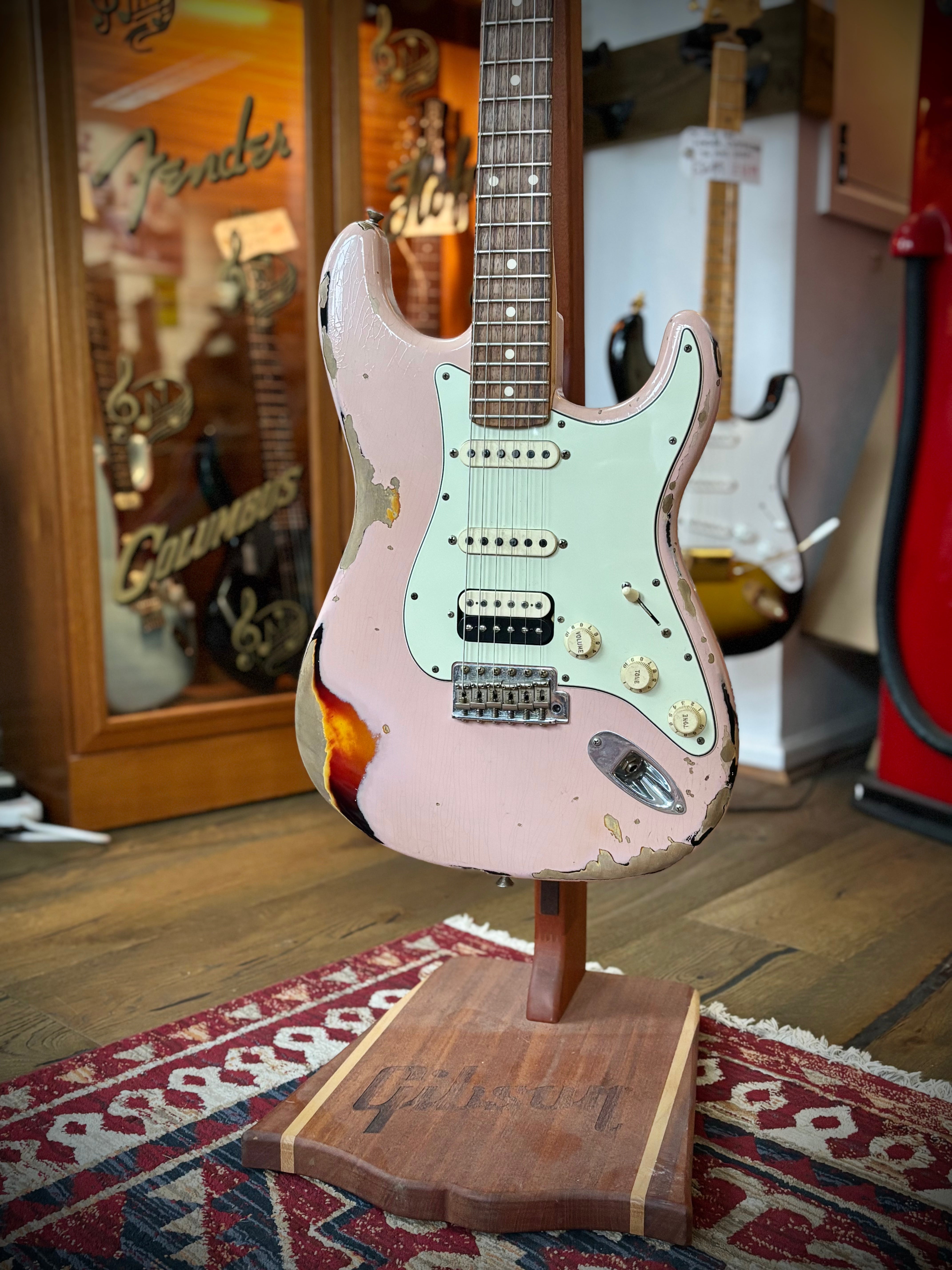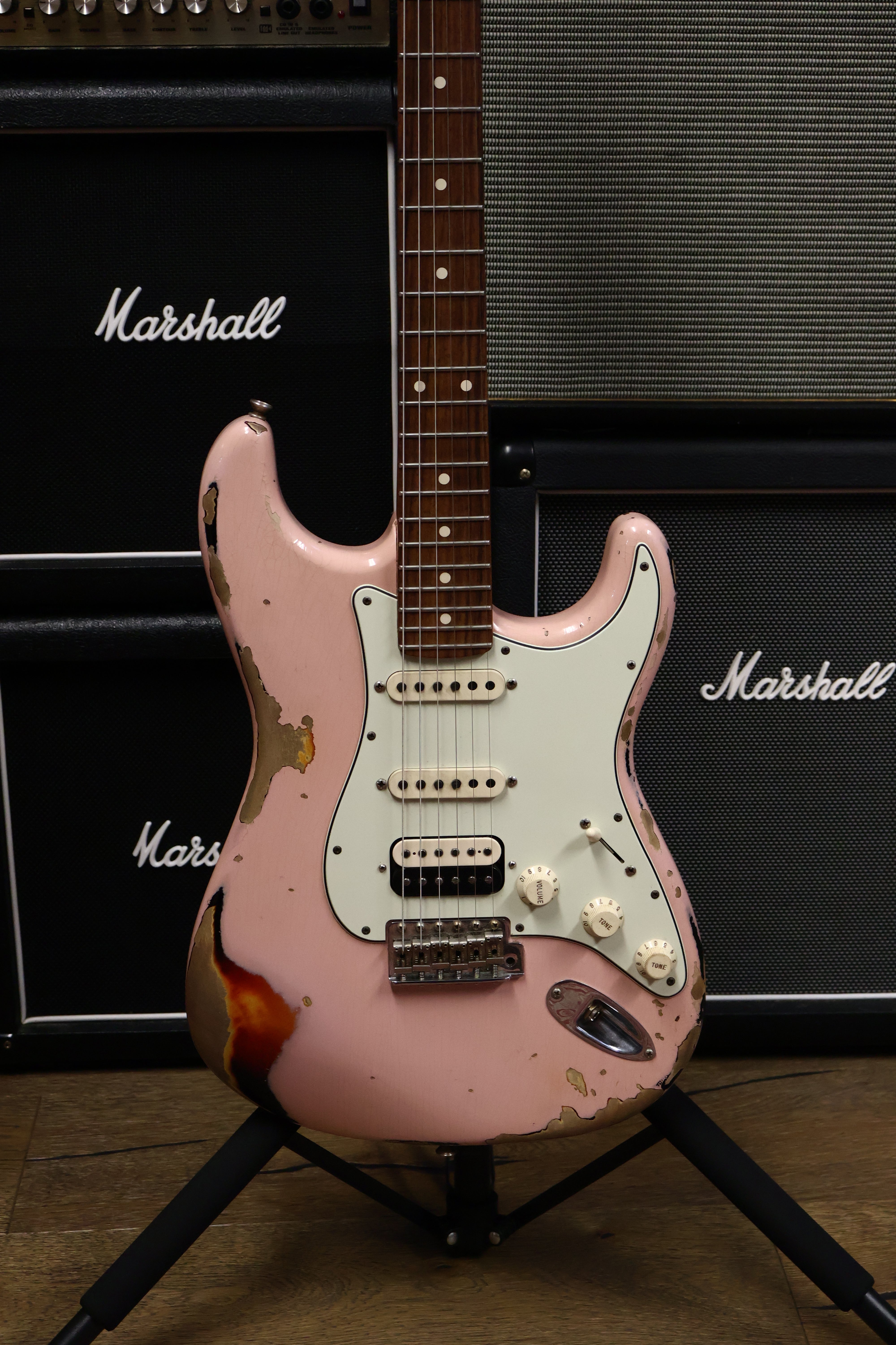 Finished in Shell Pink over 3-Tone Sunburst, and treated to a Heavy Relic finish which needs to be seen in person to be fully appreciated. It's covered in lacquer checking (which we've tried to capture in one of the photos) and has beautiful Custom Shop detailing. It's a particular unique looking strat which stands out from the crowd - and would look equally amazing with white plastics as an option.